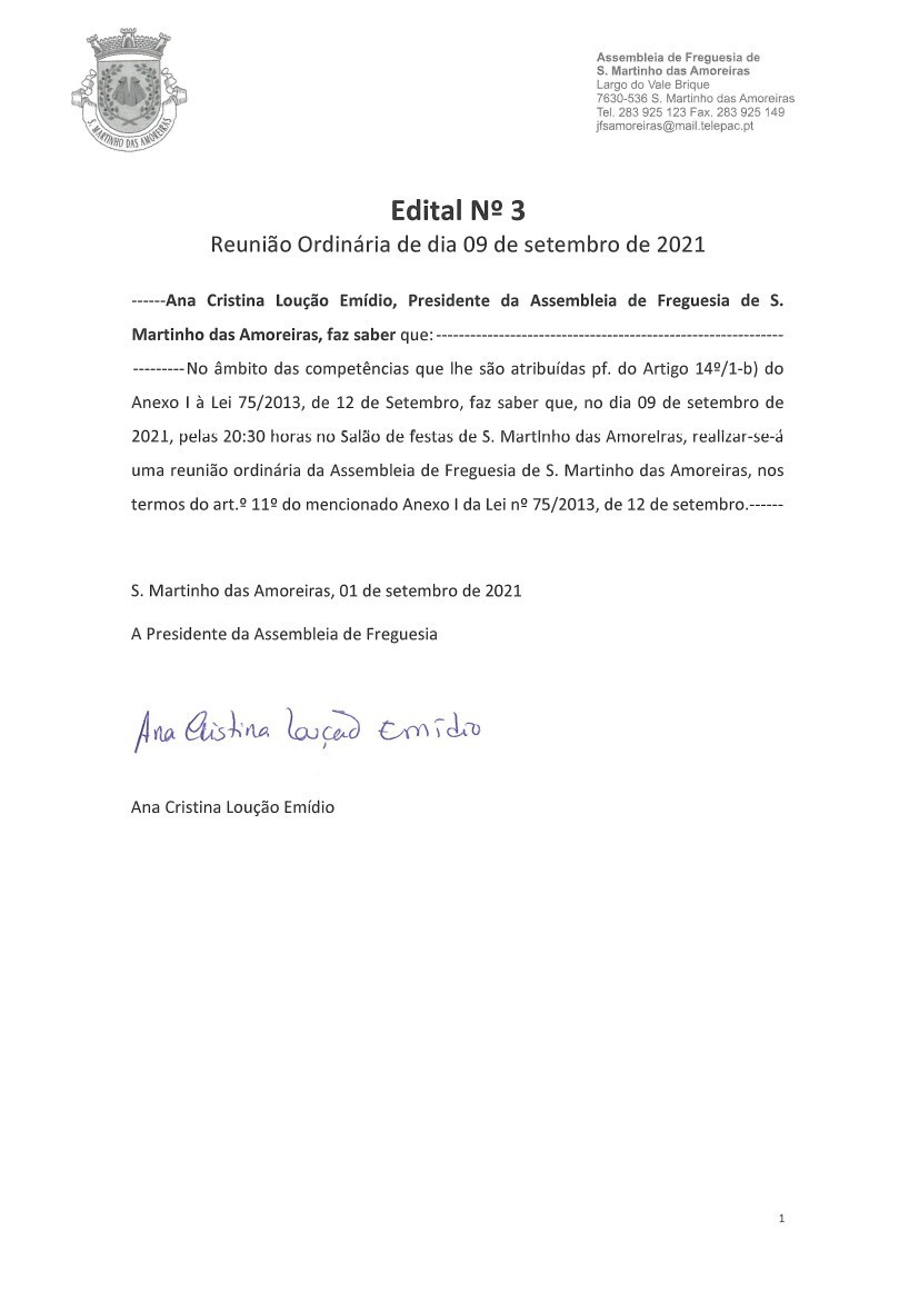 A próxima Sessão Ordinária da Assembleia de Freguesia de S. Martinho das Amoreiras está agendada para 9 setembro, quinta-feira, pelas 20h30, no salão de festas de S. Martinho das Amoreiras.