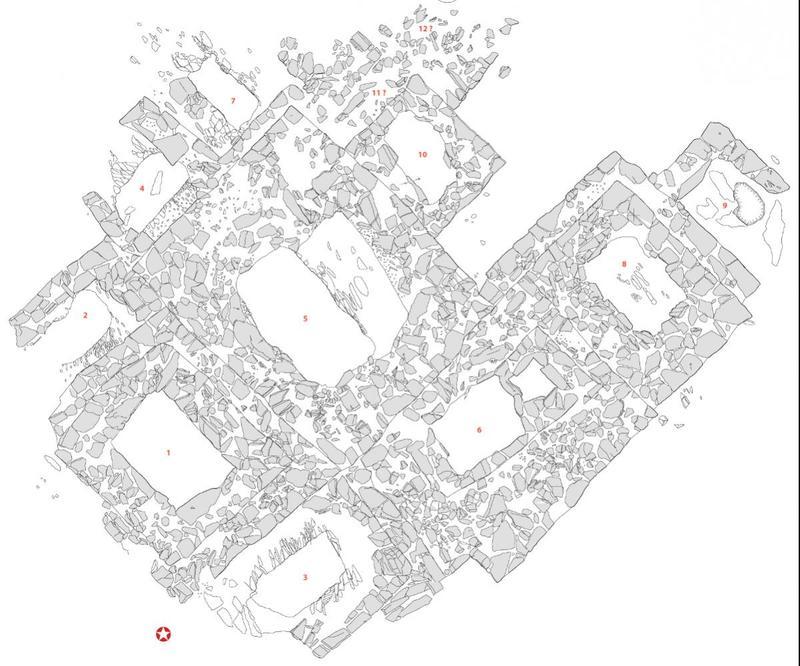 As estruturas descobertas são constituídas por onze monumentos funerários de planta sub-retangular, todos justapostos. Estes monumentos funerários, em pedra seca cobriam as sepulturas constituídas por fossas escavadas nos xistos da base, cobertas com grandes lajes, por vezes aparelhadas e decoradas.